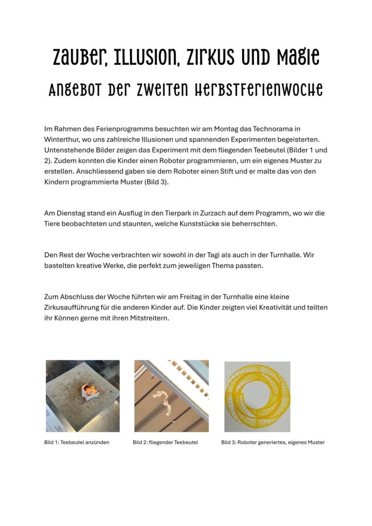 Im Rahmen des Ferienprogramms besuchten wir das Technorama, wo uns zahlreiche Illusionen und spannenden Experimenten begeisterten. Danach stand ein Ausflug in den Tierpark in Zurzach auf dem Programm, wo wir die Tiere beobachteten und staunten, welche Kunststücke sie beherrschten. Den Rest der Woche verbrachten wir sowohl in der Tagi als auch in der Turnhalle. Wir bastelten kreative Werke, die perfekt zum jeweiligen Thema passten. Zum Abschluss führten wir in der Turnhalle eine kleine Zirkusaufführung für die anderen Kinder auf. Die Kinder zeigten viel Kreativität und teilten ihr Können gerne mit ihren Mitstreitern. Untenstehend der ausführliche Bericht samt Fotos der Experimente.